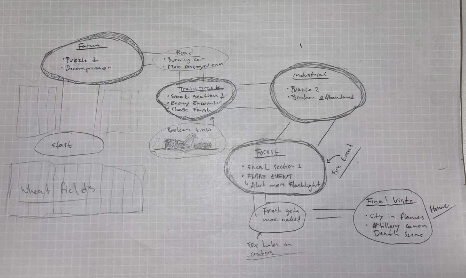 To stay within scope, I chose to map the level with a bubble diagram, placing spaces in a rough layout of the overall map. The camera's position was considered from the start, with the player view from the bottom of the page.
