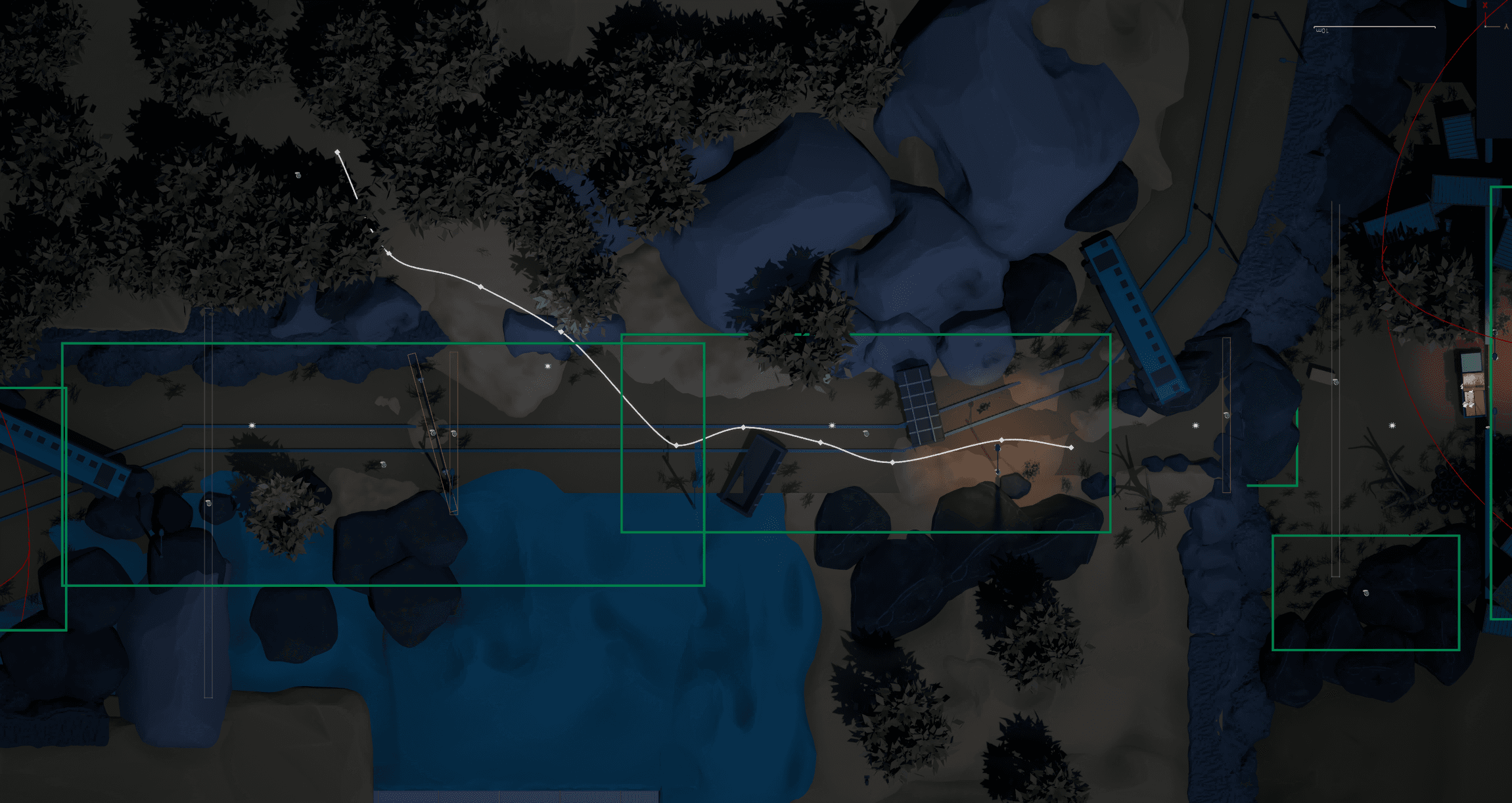 When the player clears the train-section of static enemies by crouching under a broken train cart, I wanted to create a sense of safety, only to then throw them a chase sequence.