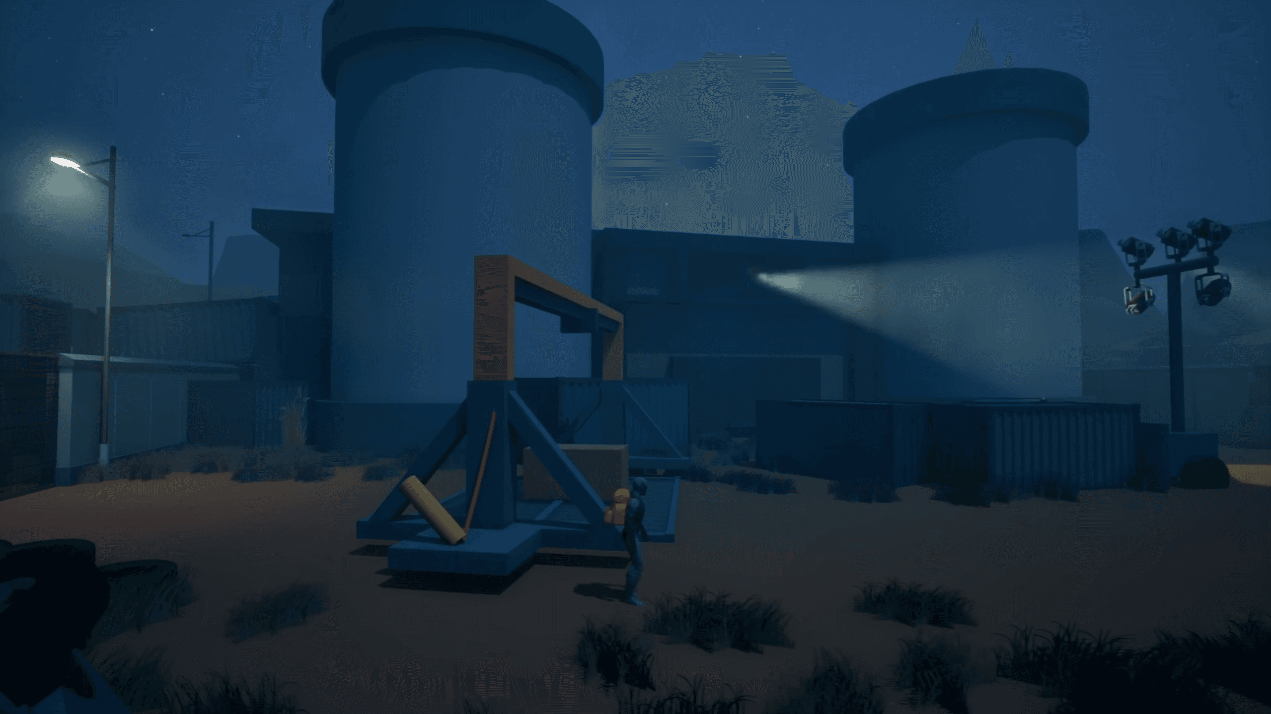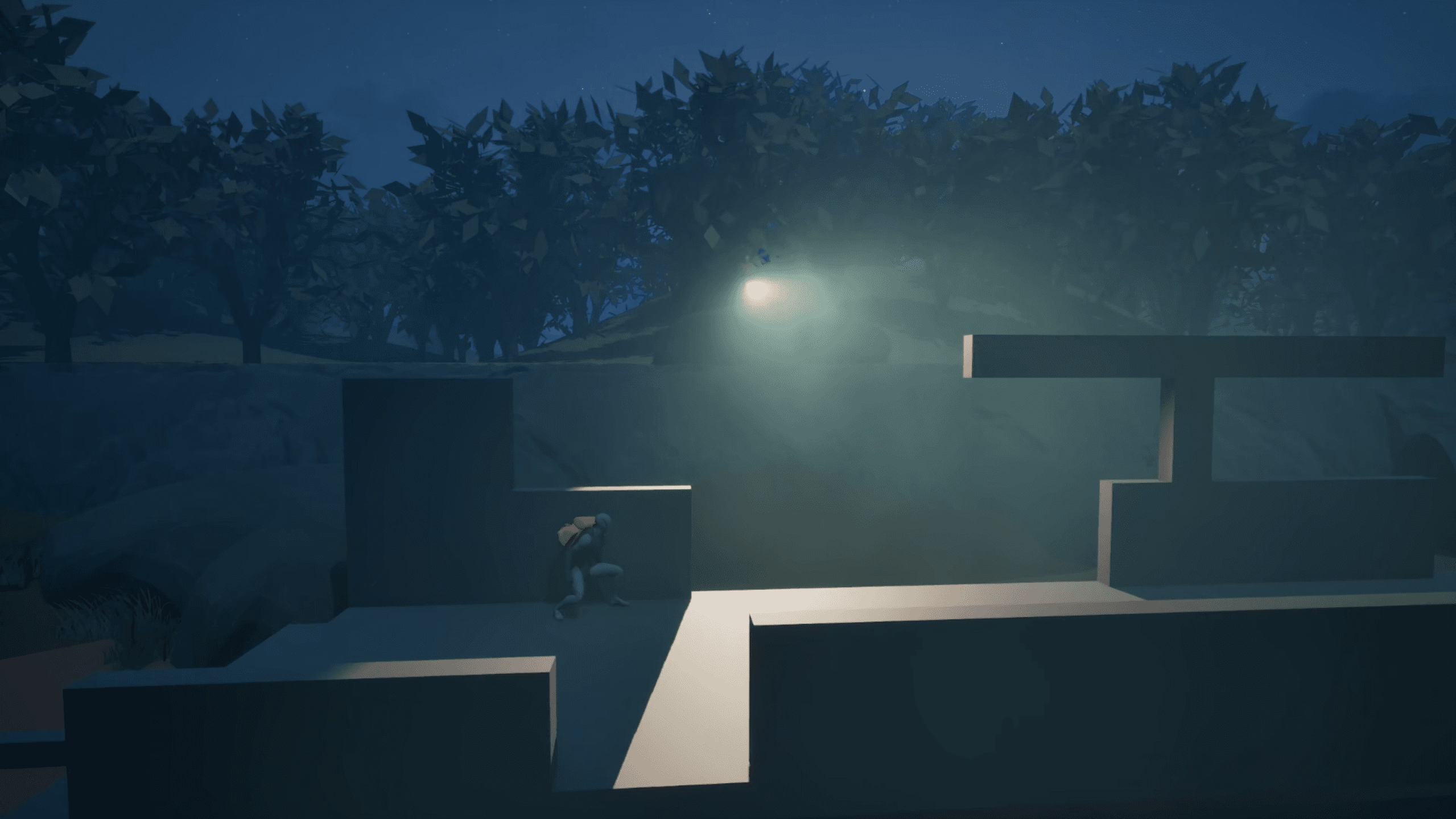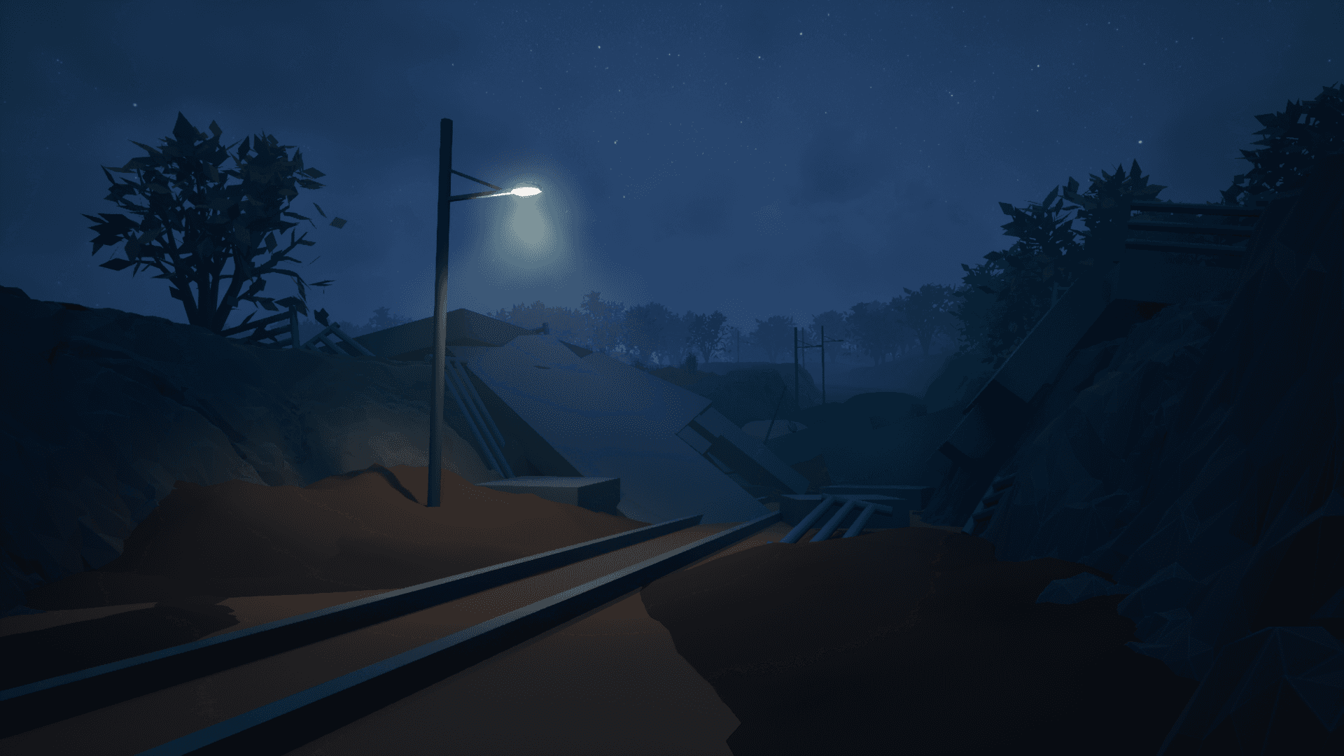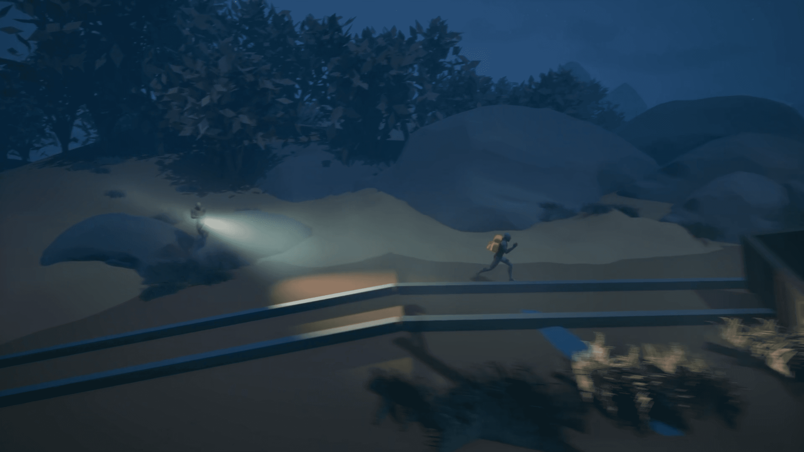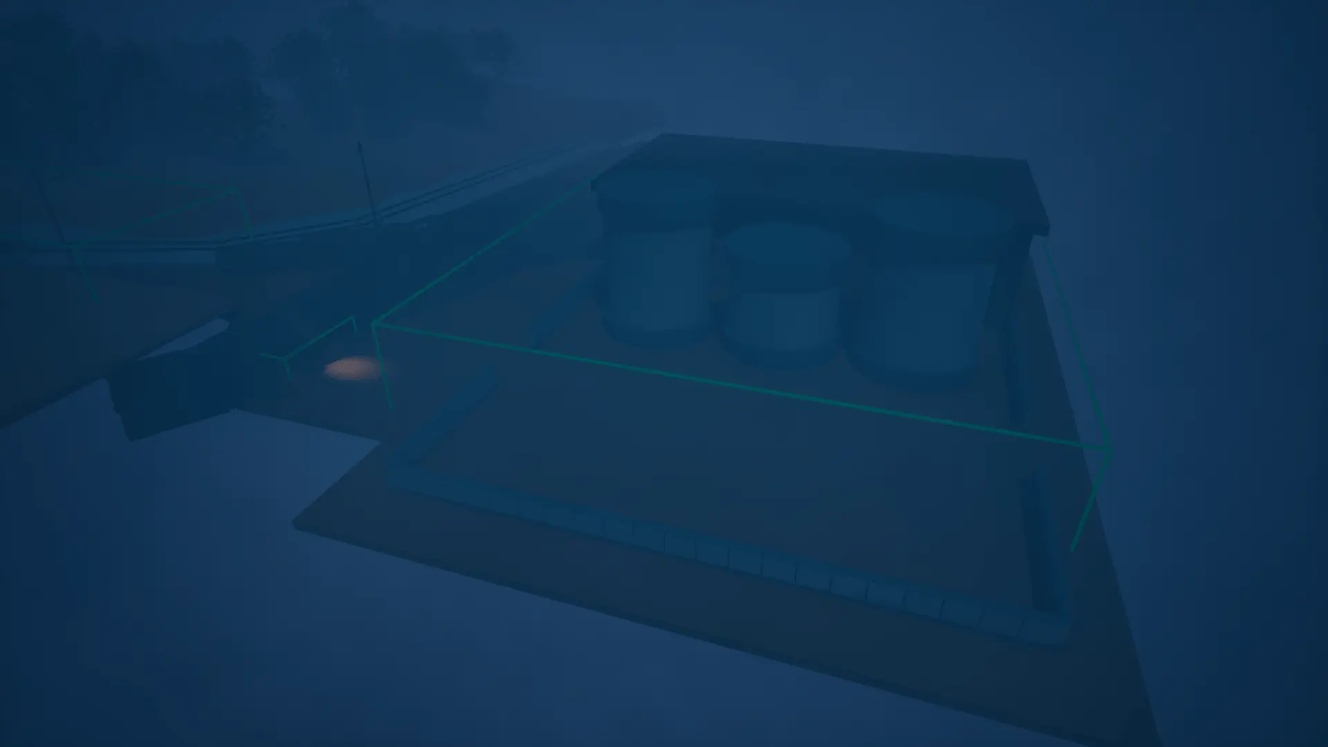 On the train tracks, a searching flashlight sequence appears above the player: visible, but not yet a threat. I want this to be eerie.