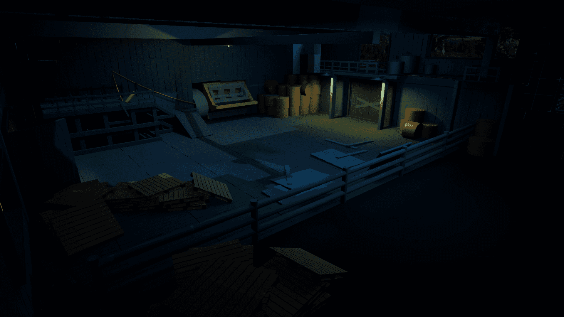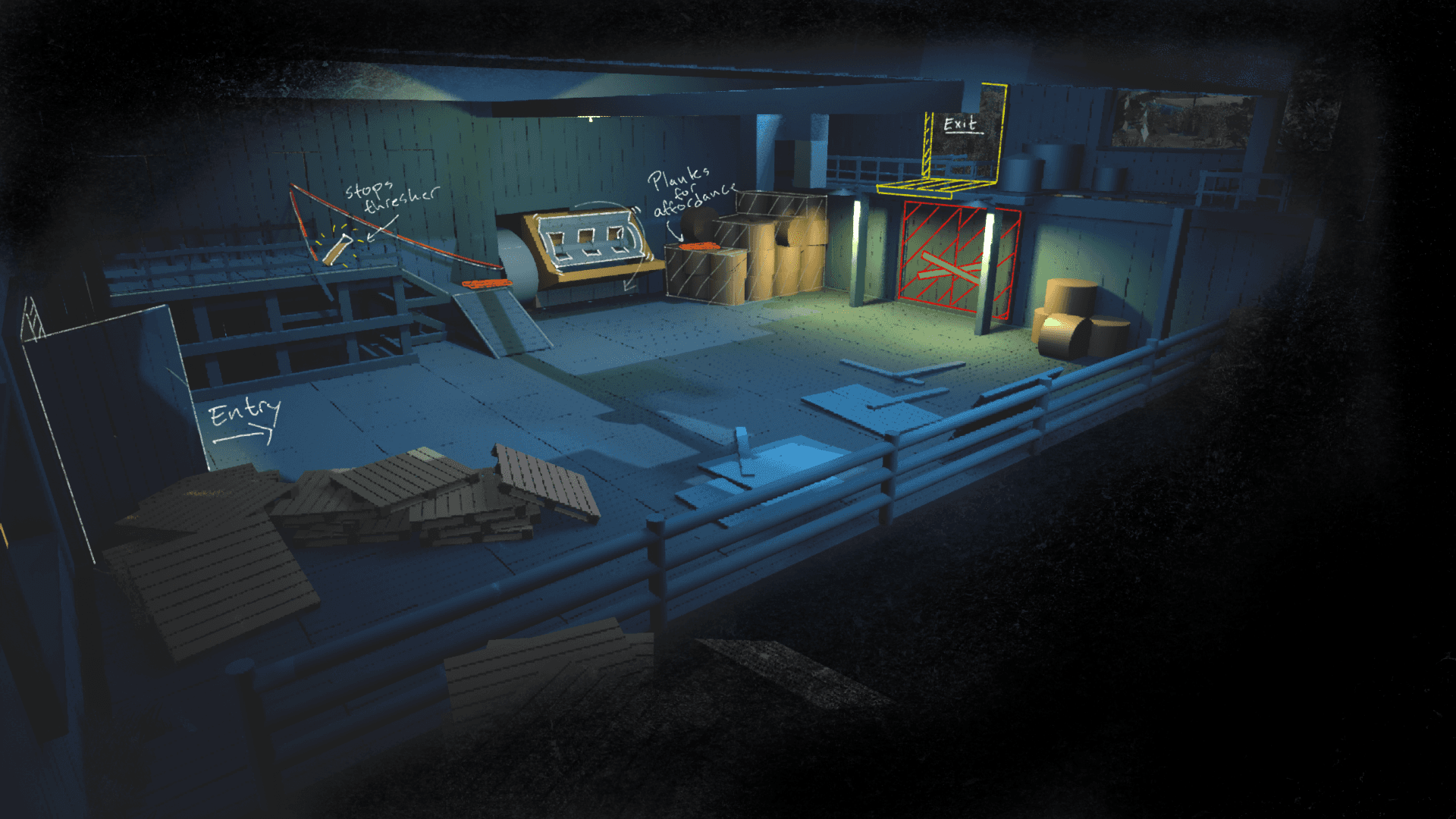 This barn was designed for immidiate clarity. When entering, the player can see both the blocked exit, and the new path above it in the same frame, establishing both the goal and the solution space in the same instantly.