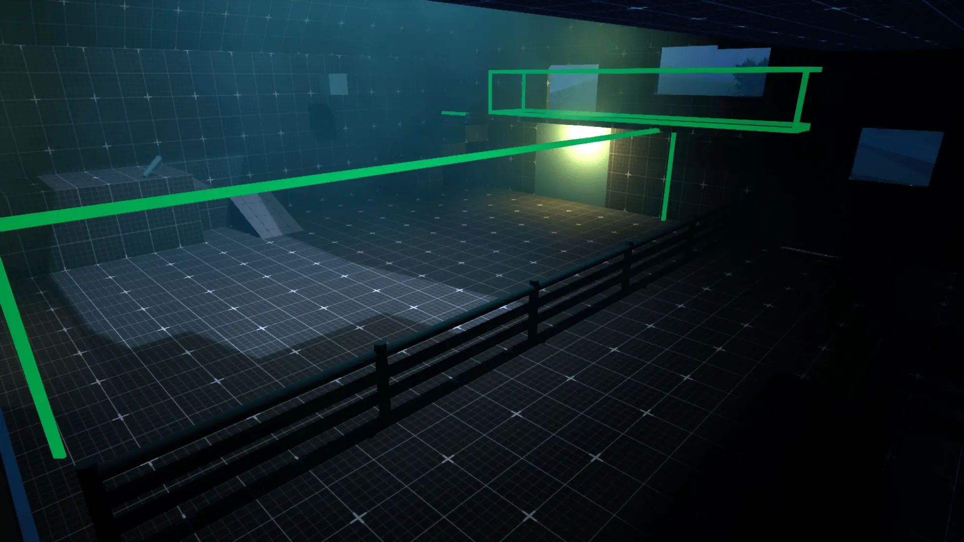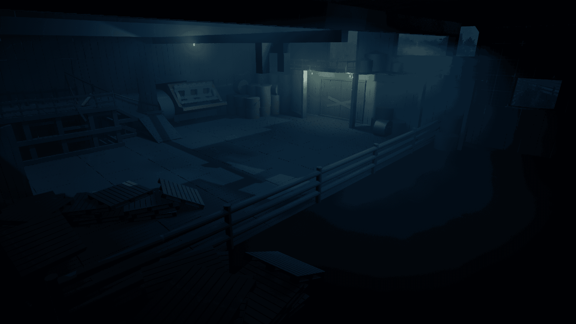 The scanning of the flashlight stands out in the otherwise dim and static lights around the level.