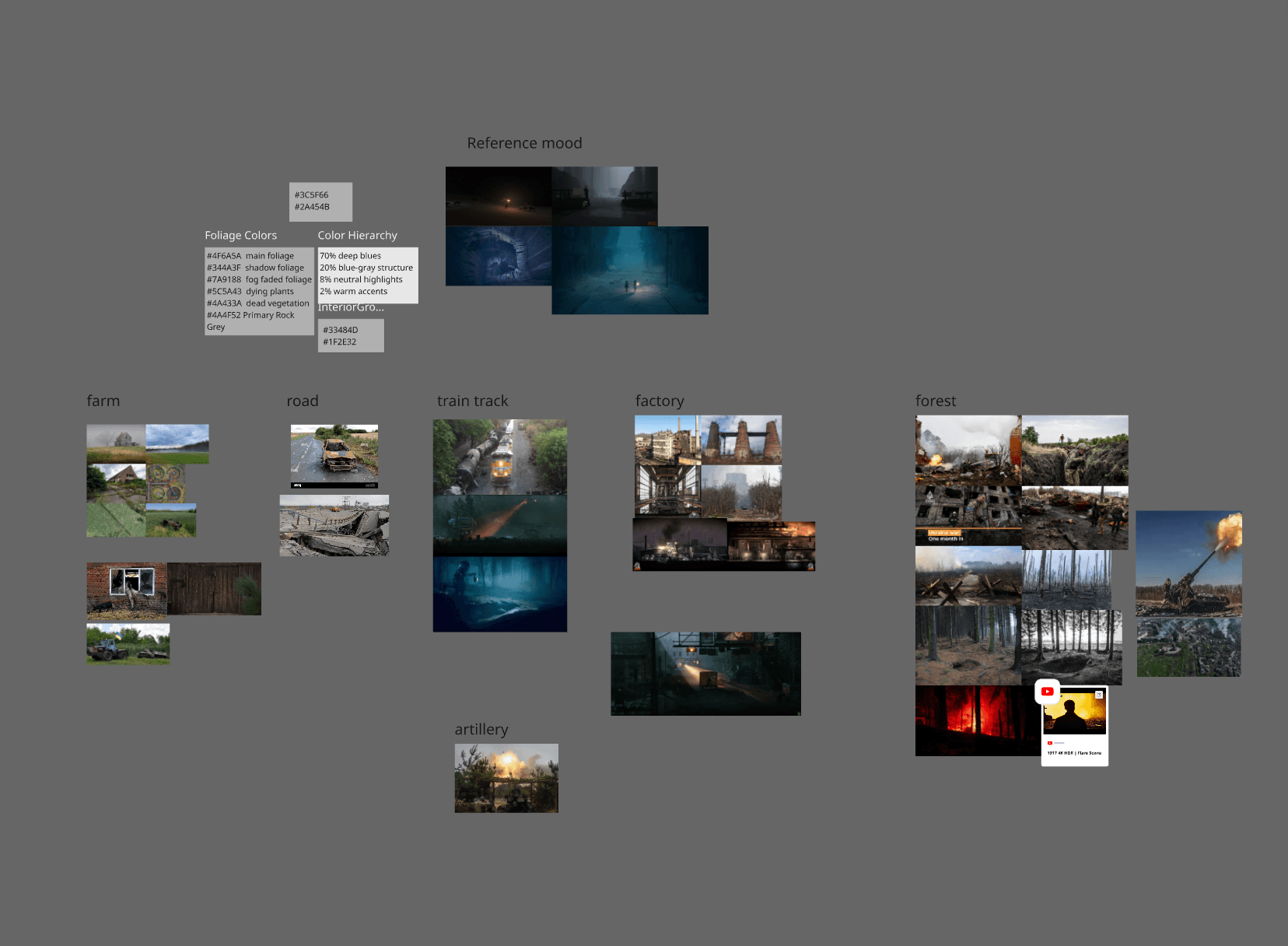 I wanted my level to have a similar look as a Tarsier Studios game. To support this, I collected references for each area, along with hex codes for the base colors palette.