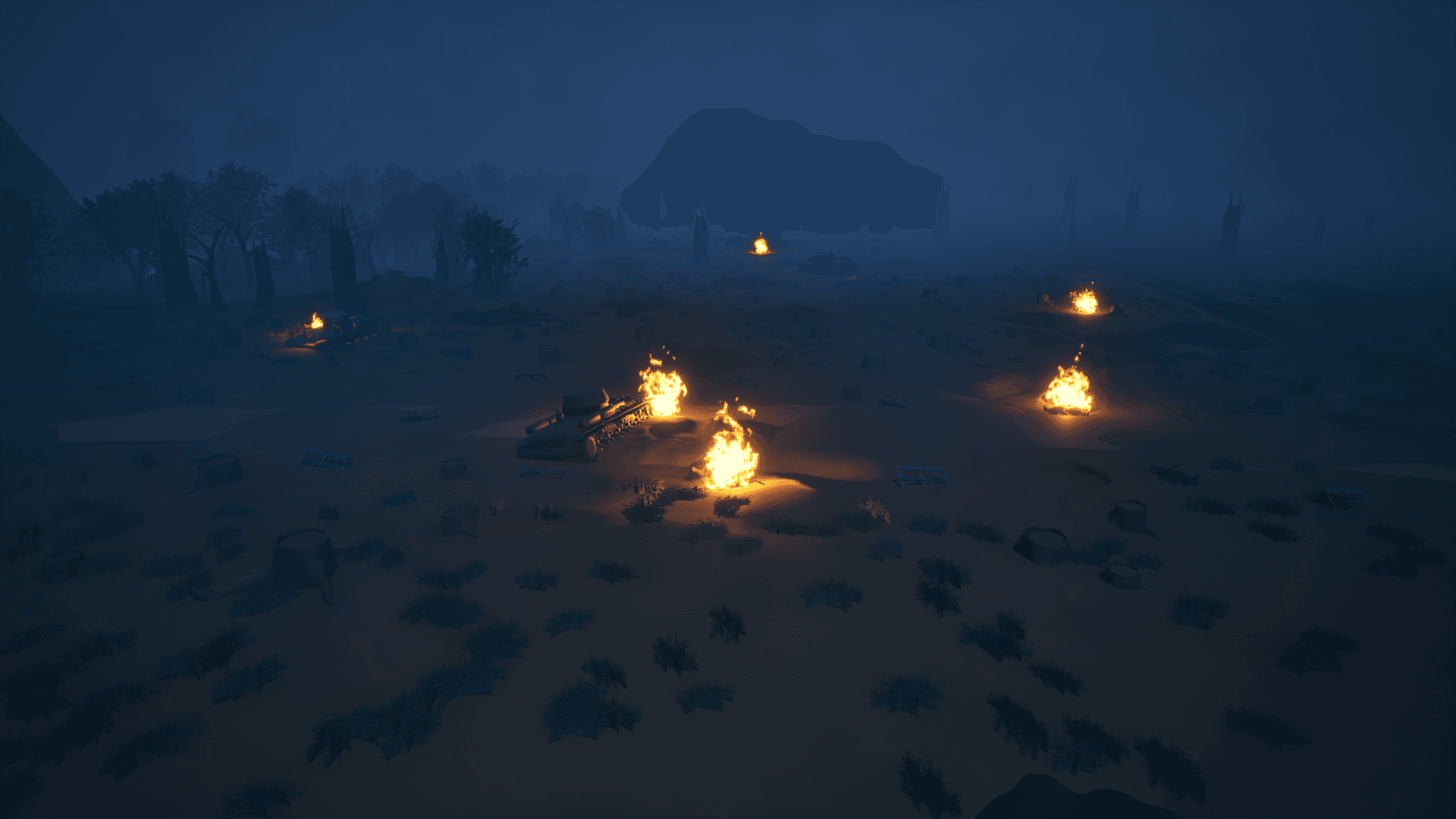 With no active combat, the player moves through a desolate space filled with burning bodies, disabled tanks, and shattered trees, while distant explosions reinforce the ongoing conflict.