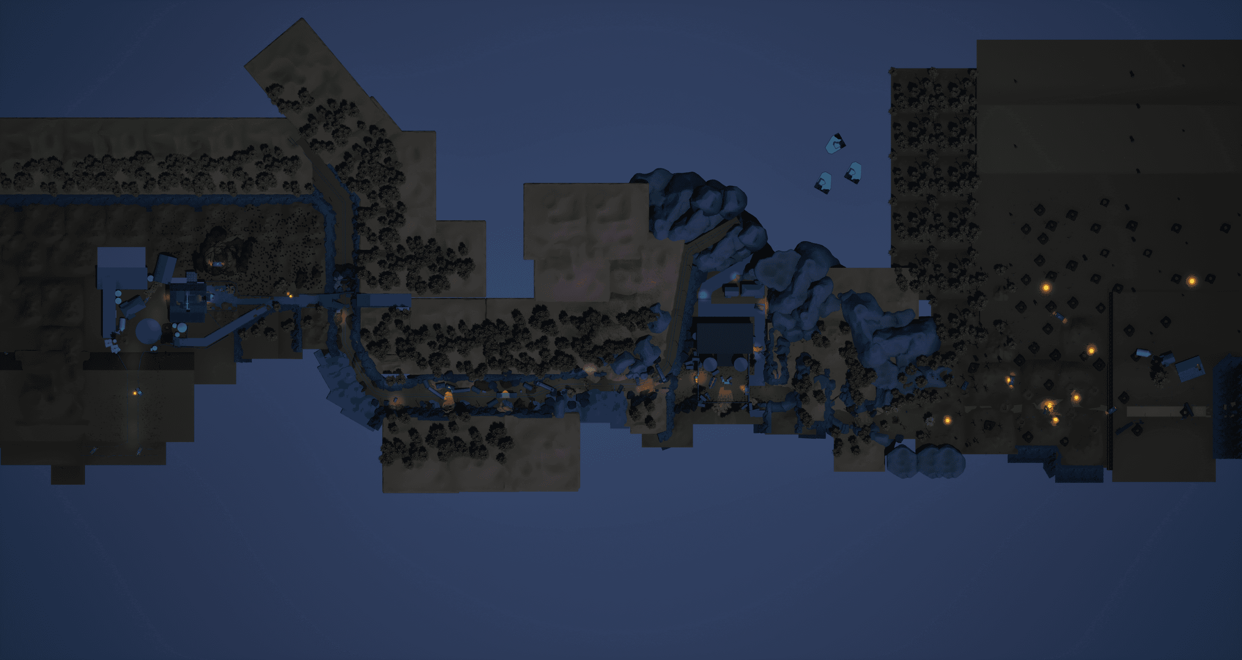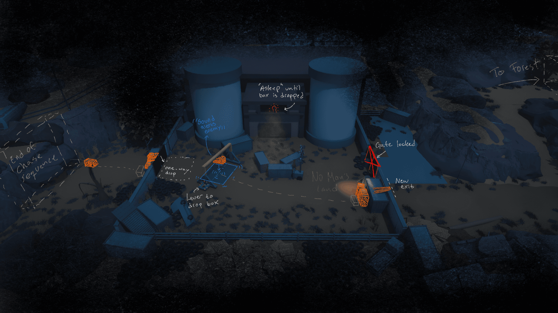 The central area of the yard provides cover, while the box drop and exit zones are exposed. This is designed for the player to use the box as a movable cover, or retreat to the safe middle zone at the cost of time.