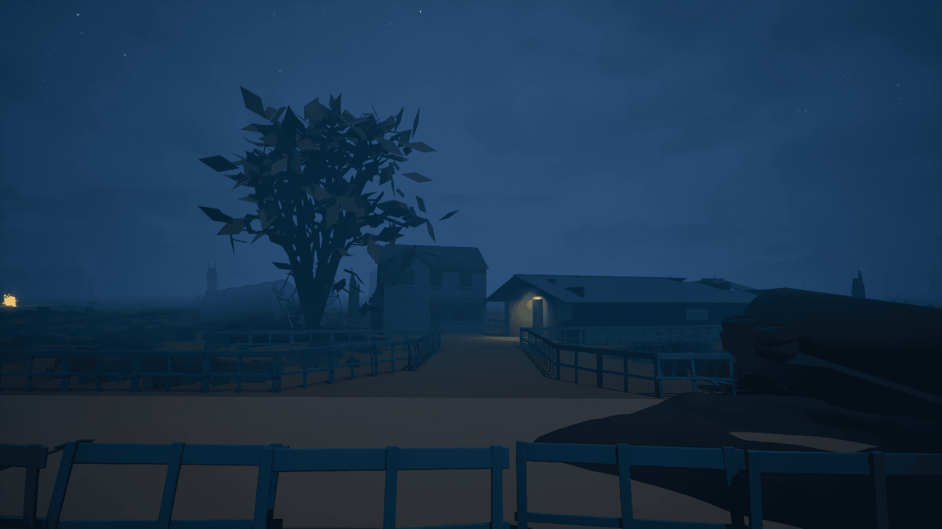 The barn light acts as a focal point, and as the player approaches, a slight camera guides them towards the entrance of the barn. The barn then introduces the first puzzle.